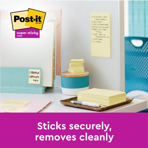| STICK AND RESTICK: Post-it® Super Sticky Notes are self-adhesive notes that stick securely on multiple surfaces; with these extra sticky & durable note pads, simply reposition lists & reminders on fridges, boards, monitors or wherever you need them |