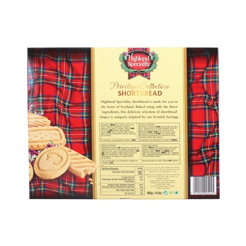 - This 400g box of Highland Speciality Privilege Collection Shortbread contains shortbread that is is baked using the finest natural ingredients, offering a selection of different shortbread shapes. Suitable for Vegetarians.