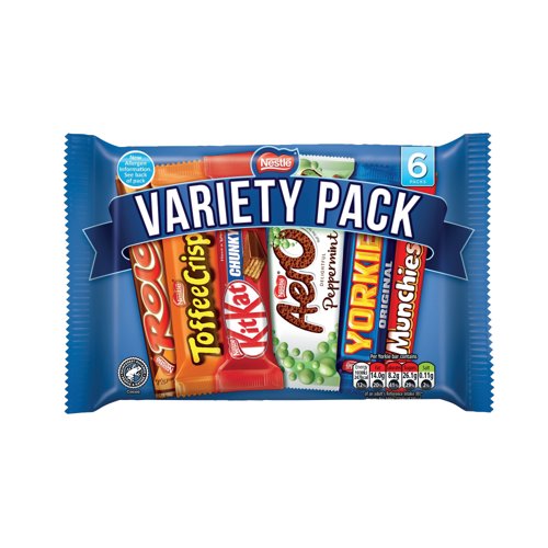Perfect for sharing, this Nestle Variety Pack contains 6 different delicious chocolate bars to suit a variety of tastes. Each pack contains 1 each of Mint Aero, Munchies, Rolos, Toffee Crisp, KitKat Chunky and Yorkie Original. The chocolate bars in this 264g pack contain no artificial colours, flavours or preservatives.