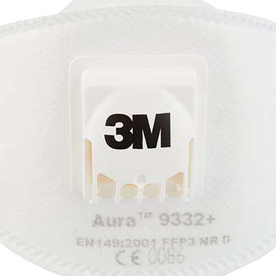 3M Aura 9332+ Flat-Fold Particulate Respirator. Advanced three-panel design and low breathing resistance Filter technology applied to the 3M Aura 9300+ series provides optimum comfort and easy communication, thus ensuring improved wearer acceptance even during long working hours. Being foldable they offer you more convenience than traditional cup shaped respirators. Its features include an embossed and sculpted top panel for improved compatibility with reduced fogging of eyewear and an innovative chin tab to improve the ease of fitting. Provides respiratory protection against higher levels of fine dusts, mists, and metal fume, Low Breathing Resistance Filter Technology gives effective filtration with low breathing resistance for consistent high quality performance. Fold-Flat, easy to store, proprietary 3-panel design accommodates facial movement for wearer comfort. Individual hygienic packaging helps protect the respirator from contamination before use. 3M Cool Flow exhalation valve offers improved comfort in hot and/or humid environments and where work is physically demanding. Smooth inner cover-web and large soft nose foam for greater comfort against the skin. Even-tensioned straps relieve pressure for a comfortable and secure fit. Red colour coded straps denoting FFP3 protection level. Standard: EN149:2001 FFP3 NR D, Approval: CE Marked, Assigned Protection Factor: 20.