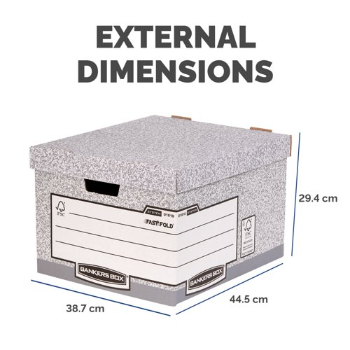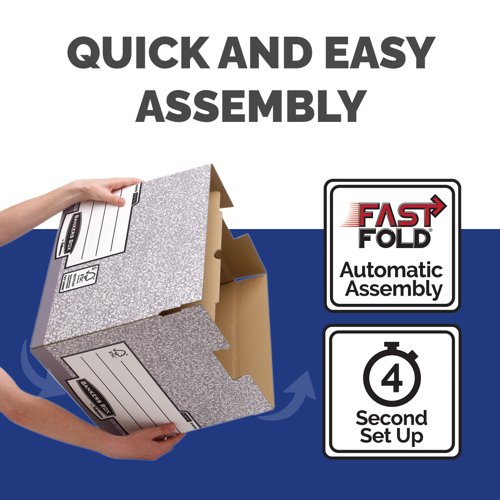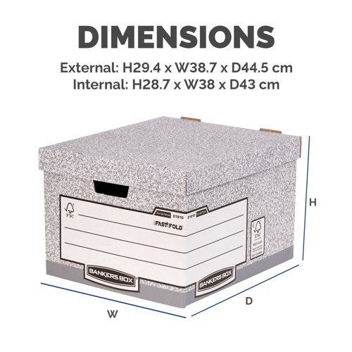 This Bankers Box large storage box features time saving FastFold automatic assembly and is stackable up to 4 high. The box also features double layered board on the handle panels and base for extra strength. Compatible with Bankers Box 120mm transfer files, this large grey box measures W430 x D380 x H287mm (internal). This pack contains 10 boxes.