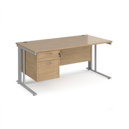 Maestro 25 straight desk 1600mm x 800mm with 2 drawer pedestal - silver cable managed leg frame, kendal oak top