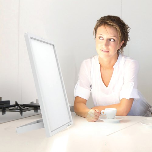 The Dayvia lamp features a sleek design and fine lines give it a high-end graphic effect. Suitable for displaying on a large table or furniture in a living room. Allowing light therapy sessions alone or with others, this large lamp is effective with three functions, including DAY+ technology and two therapeutic lighting modes with intensity functions that are adjustable for an optimal comfort and efficiency. Featuring a a timer, this therapeutic lamp is a CE certified medical device allowing for a complete light therapy session.