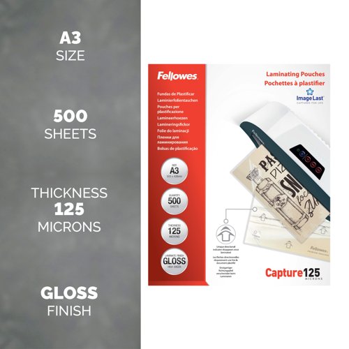 Fellowes Laminating Pouches 250 Micron Total Thickness Gloss A3 (Pack of 500) 100144250