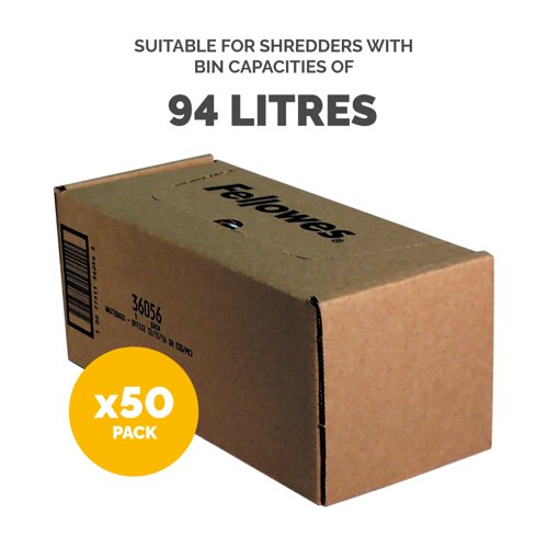 | These bags are suitable for shredders with bin capacities of 94 litres, making them perfect for large volumes of shredding in larger office environments. These bags are ideal for accommodating heavy usage and ensuring that your shredder operates efficiently without frequent bag changes |