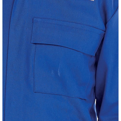 300 gram 100% cotton drill fabric with flame retardant treatment. FR reflective tape. (Nordic Pattern). Concealed stud front to neck. One left breast pocket with flap. Two front hip pockets. Knee pad pockets. Plain back and hips ISO11611: 2007 Class 1 A1 - Protective clothing for use in welding ISO11612: 2008 A1. B1. C1 - Protection against heat and flame. Does NOT conform to EN ISO 20471.